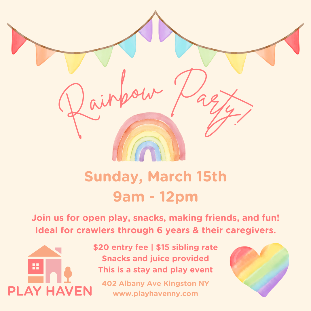 rainbow party! Sunday, March 15, 2026 9:00 AM 12:00 PM Play Haven 402 Albany Avenue Kingston, NY, 12401 United States (map) Google Calendar ICS let us know you're coming!